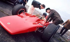 Innes Ireland peers into the cockpit of Graham Hills Lotus 56 – plenty of intrigue in how the gas-turbine car works!